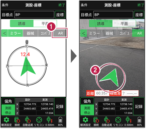 1 測設・座標の誘導画面で[AR]をタップします。