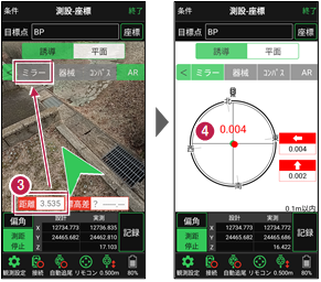 3 距離を確認し、目標点に近づいたら、[ミラー]をタップしてAR誘導を解除します。