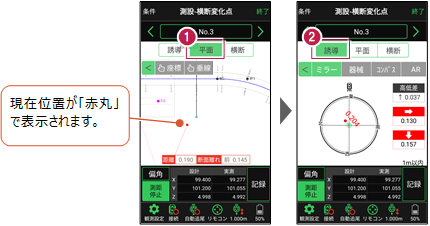 設置位置を指定した後[偏角]をタップすると、計測点方向に器械が自動回転します。