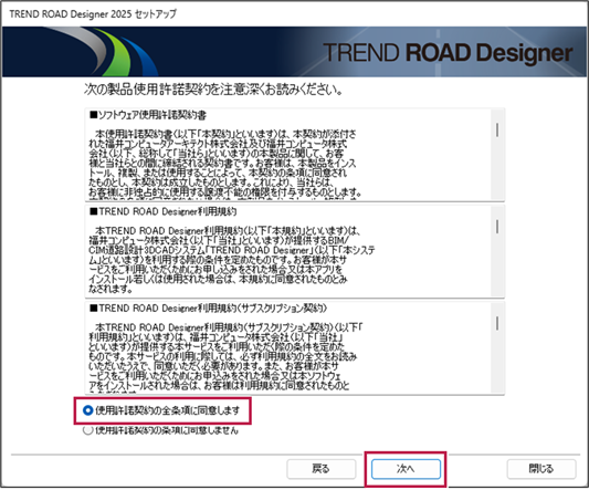 5. [使用許諾契約の全条項に同意します]を選択して、[次へ]をクリックします。