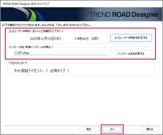 6. コンピューターの時計、インストール先のフォルダーを確認します。必要に応じて変更し[次へ]をクリックします。