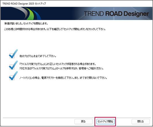 7. 内容を確認して、[セットアップ開始]をクリックします。プログラムのインストールが開始されます。