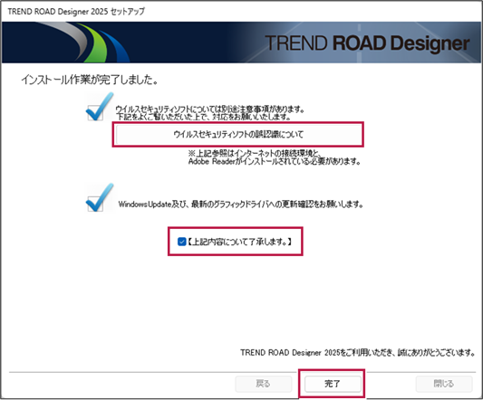 8. インストール完了の画面が表示されたら、[ウイルスセキュリティソフトの誤認識について]を確認してください。